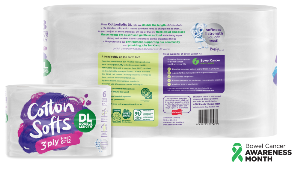 This Awareness Month, Cottonsoft is once again helping take our message straight into Kiwi homes with selected toilet tissue packs labelled with key bowel cancer symptoms.